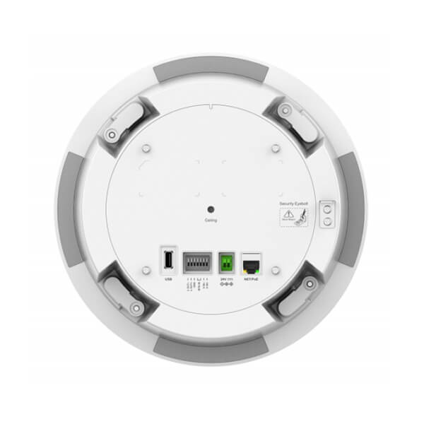 - Ports include 1x 2-pin switch-in input, 1x alarm-in input, 1x DC24V, 1x network, and 1x USB port; Keys include volume up/down, and reset